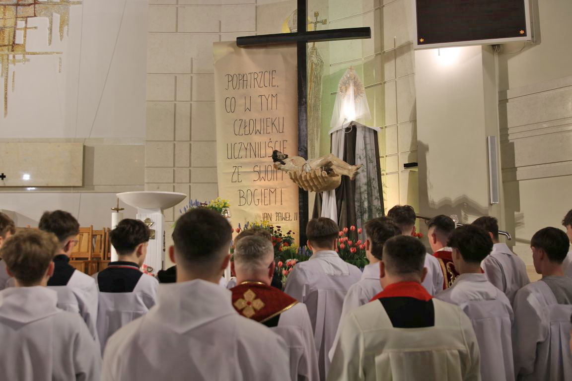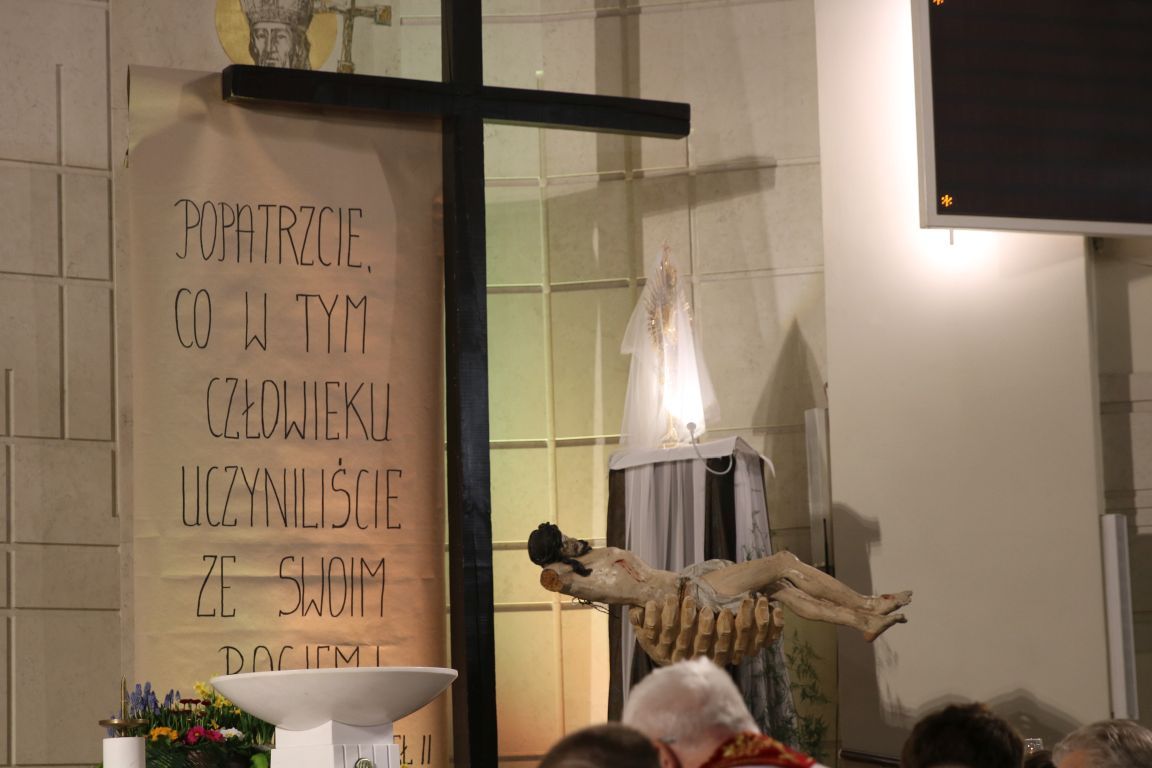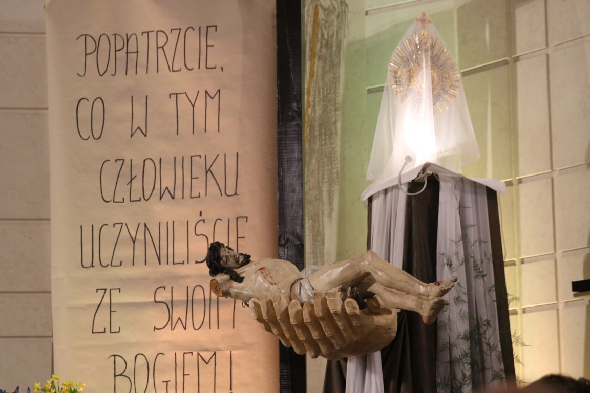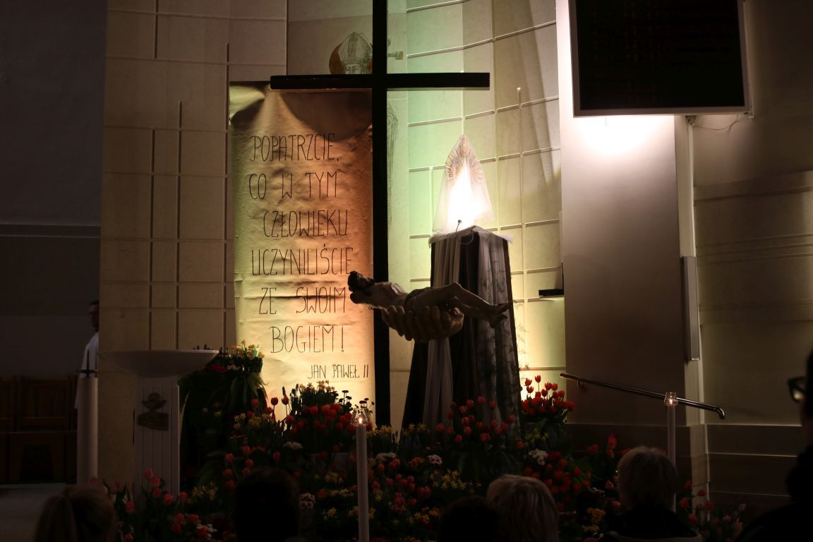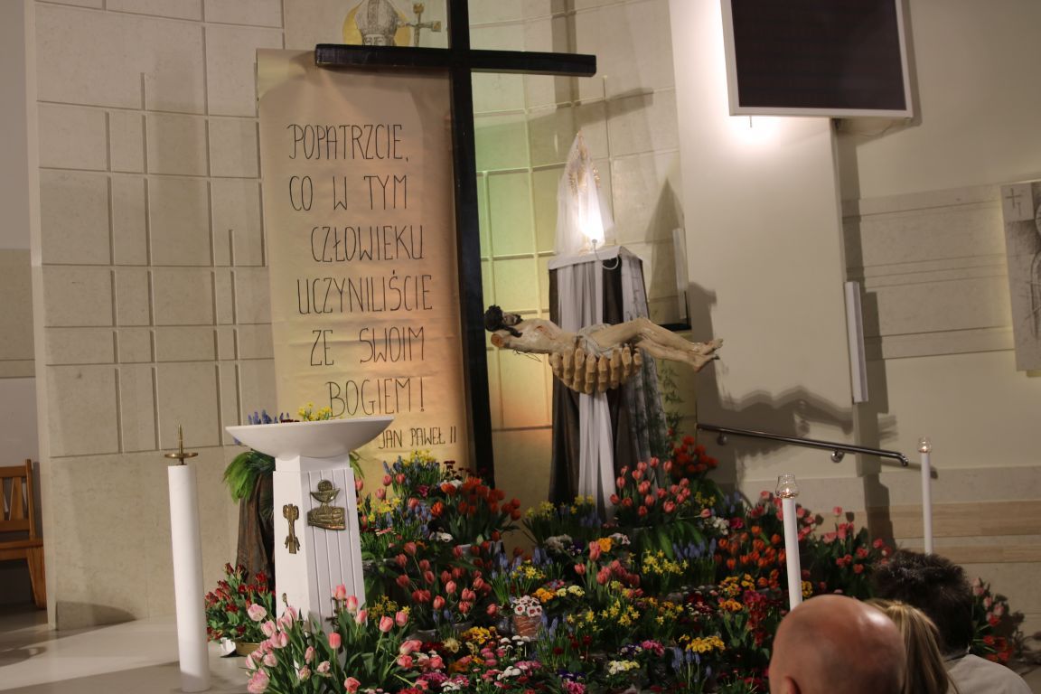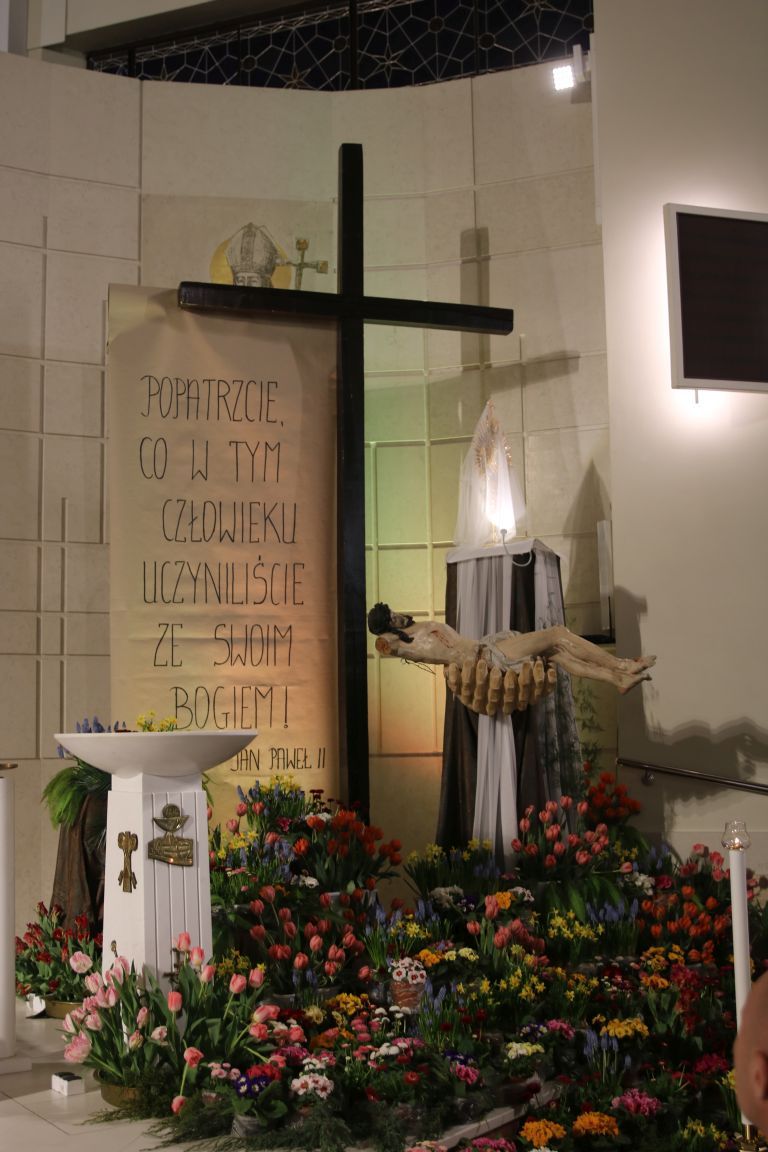 W tym roku Grób Pański w naszym kościele odwołuje się do rozważań Jana Pawła II w napisanej przez niego Drodze Krzyżowej: „Popatrzcie, co w tym Człowieku uczyniliście ze swoim Bogiem”.